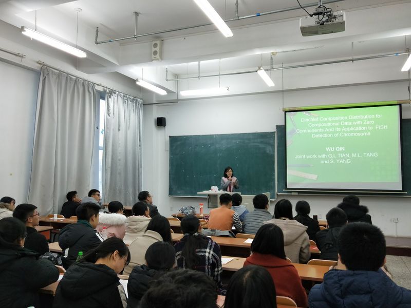 报告会中,吴琴老师结合她多年的学习,教学和研究经验,向同学们介绍了成分数据的概念。此外,吴琴老师通过举胎儿18号染色体异常的例子向同学们表明了染色体病在人群中有一定的发病比例,而这些病变多数会影响本人或其下一代。并且具有家族性,她进一步表明数据分析的强大作用。她用生动形象的语言为大家介绍了统计学未来的发展趋势并且分享了快速、高效学习的方法。最后,beat365官方网站的老师和同学们与吴琴老师进行了互动,同学们及时提出了自己的疑惑,吴琴老师也对同学们提出的问题进行了详细的解答,并激励同学们要担负起数学与统计人才应有的使命,为我国的数学与统计学建设作出应有的贡献,也希望大家能够脚踏实地的学习理论知识,为数学与统计学的发展不懈努力。
