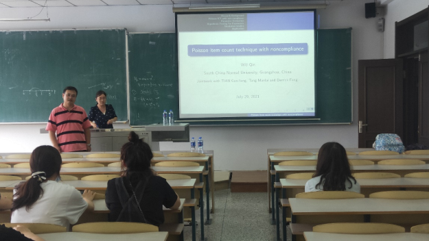 报告会中,吴琴博士首先讲解了众所周知的项目计数技术(ICT)及其应用背景,进一步表明该技术将已知比例的独立无害问题列表替换为单个无害计数问题,同时引出项目计数技术(ICT)的天花板和地板效应的缺点。但是,仍存在无论是否存在“不真实”的假设,受访者都会给出“不真实”答案的情况。随后,吴琴博士又向大家教授了解决回答者自我保护行为的问题并提供更可靠的分析模型的定义即泊松项目计数技术。进一步向大家展示了模型的矩估计,极大似然估计以及模型参数问题的解决。最后,吴琴博士向大家了介绍了其仿真研究的结果,可以看出当数据量足够大时该方法的性能很好。并通过一个汽车保险欺诈的实例形象地向大家展示PICT方法。实证使大家对于PICT方法有了更加深入的了解和兴趣。
