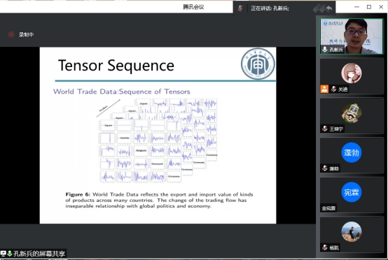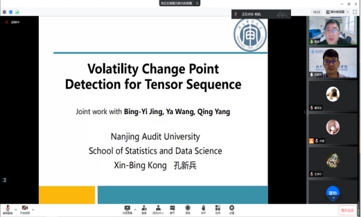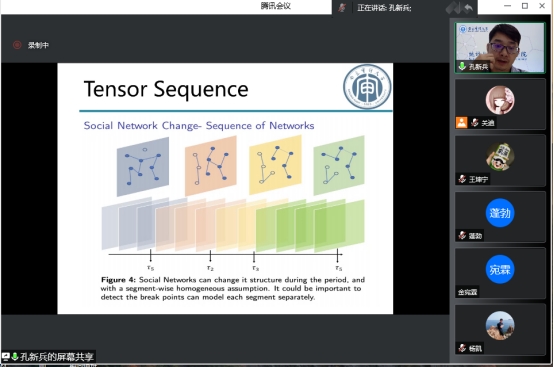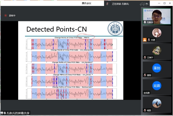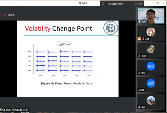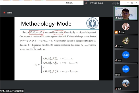 孔新兵教授为我们全面系统的分享了Methodology-Model。主要讲解模拟研究、实际案例部分,引发了同学们浓厚的学习兴趣与讨论热情。一方面激发了同学们关于数学模型理论建立的研究热情,另一方面让同学们对张量序列的波动变化点检测在实际生活、在当今中国的用途更加明确。报告结束后,孔教授对同学们提出的诸多问题一一做了回答。在场师生均表示聆听本次报告受益匪浅,收获颇多。