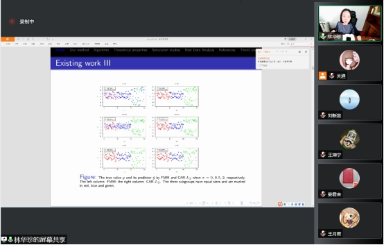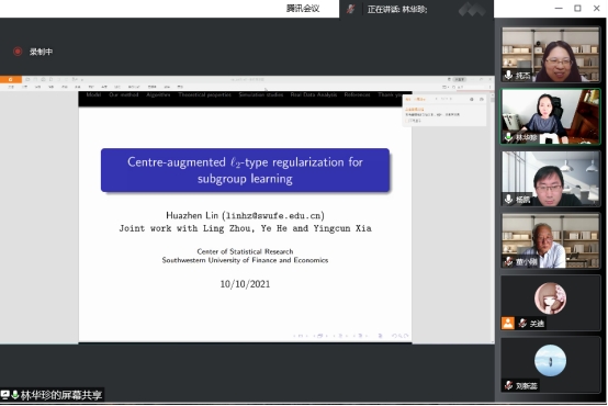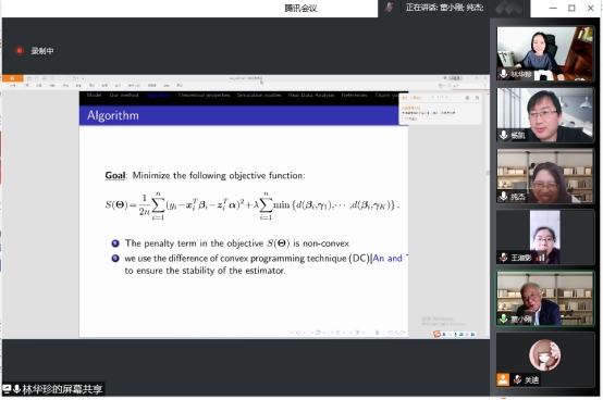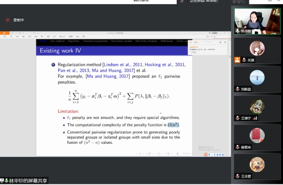 本次报告会的主题是“用于亚组分析的中心增强L2型正则化”,报告会伊始,林华珍老师介绍了亚组分析方法,通过在损失函数中引入群中心和L2型惩罚,提出了一种新的中心增强正则化(CAR)方法。该方法可以被看作是正则化方法和FMM的统一。与现有方法相比,该方法具有更高的效率,更好的稳健性,也更方便计算。特别地,它的计算复杂度从传统的成对惩罚方法的O(n^2)降低到O(nK),其中n是样本大小,K是亚组的数量。建立了CAR的渐近正态性,证明了算法的收敛性。最后老师介绍了也将CAR应用于一个多中心临床试验数据集:丁丙诺啡治疗鸦片依赖。与现有方法相比,得到了更大的R^2,并确定了三个额外的重要变量。