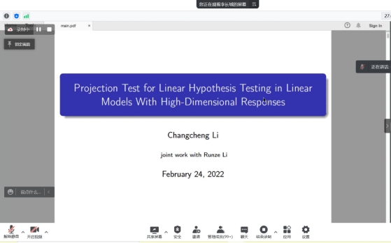 2022年2月24日下午15:00,我院特邀大连理工大学李长城教授做线上学术报告,报告由学院统计系副主任杨凯老师主持。学院部分老师,本科及研究生共125人参加本次线上学术报告。