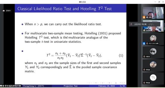 检验在高维情况下的不适用性。随后,李长城教授着重介绍了投影检验的想法,其思想是将高维数据投影到低维空间中,再利用经典的检验方法进行检验,并指出问题的关键就是寻找投影矩阵,而以往随机生成的投影矩阵会带来一些问题。李长城教授在最优投影检验的基础上提出了U投影检验方法,推导了U投影检验的性质,通过数值模拟以及实例说明新方法的优势,讲解方式深入浅出,不仅让师生收获颇多,也激发了同学们对此研究方向浓厚的学习兴趣。