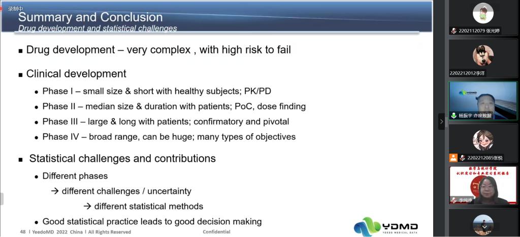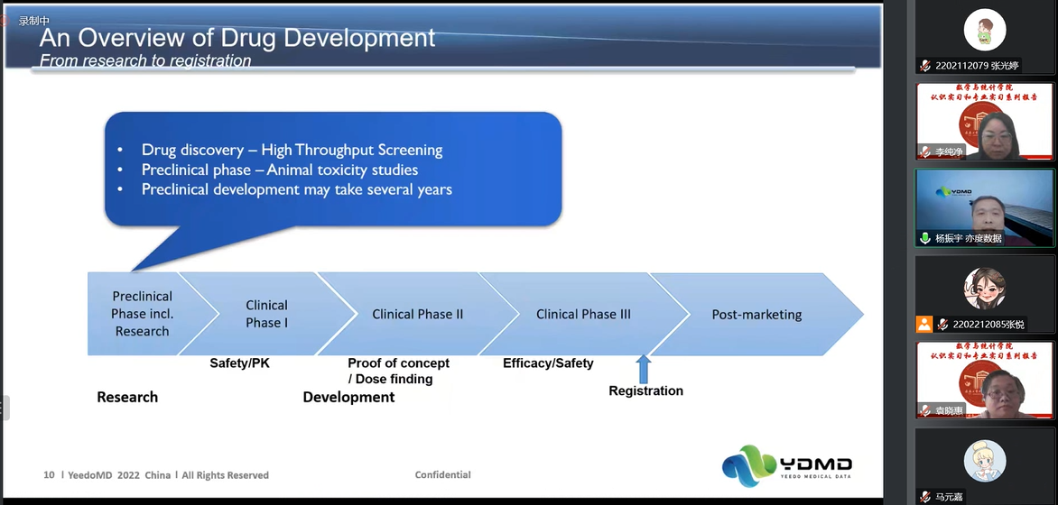 在报告会中,杨振宇老师从药物开发与生物统计概述、适应性临床设计和生物统计学家以及临床试验中的角色三个方面出发,系统地讲述了药物生产的全部流程,以及制药过程中可能会出现的问题。并在此基础上详细地介绍了统计师和编程师在整个药物研发的全周期的工作内容以及工作要求。最后,针对生物统计师的发展前景,对同学们学习能力和知识水平提出要求。