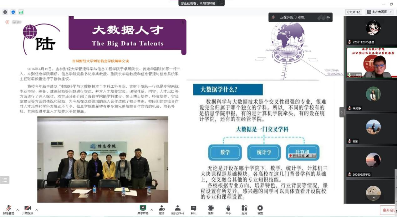 (通讯员:杨凯)2022年12月3日下午19:00,我院特邀辽宁大学于卓熙做题为《数据科学及其应用》的报告。本次报告由学院副院长李纯净主持,学院院长王纯杰、统计系主任杨凯、统计系党支部书记袁晓惠、2020级、2019级本科以及部分研究生参加了本次线上报告。