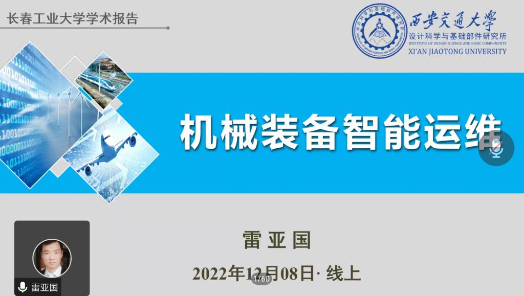 (通讯员:关迪)为丰富学生的学习生活,提高学生的综合能力,2022年12月8日下午19:30,由科研处和beat365官方网站承办的“机械装备智能运维”在腾讯会议线上举行,特邀西安交通大学雷亚国教授做报告,为beat365官网师生进行讲解,beat365官方网站院长王纯杰、副院长李纯净、统计系主任杨凯、学院部分老师,本科及研究生共215人参加本次线上学术报告,报告由院长王纯杰主持。