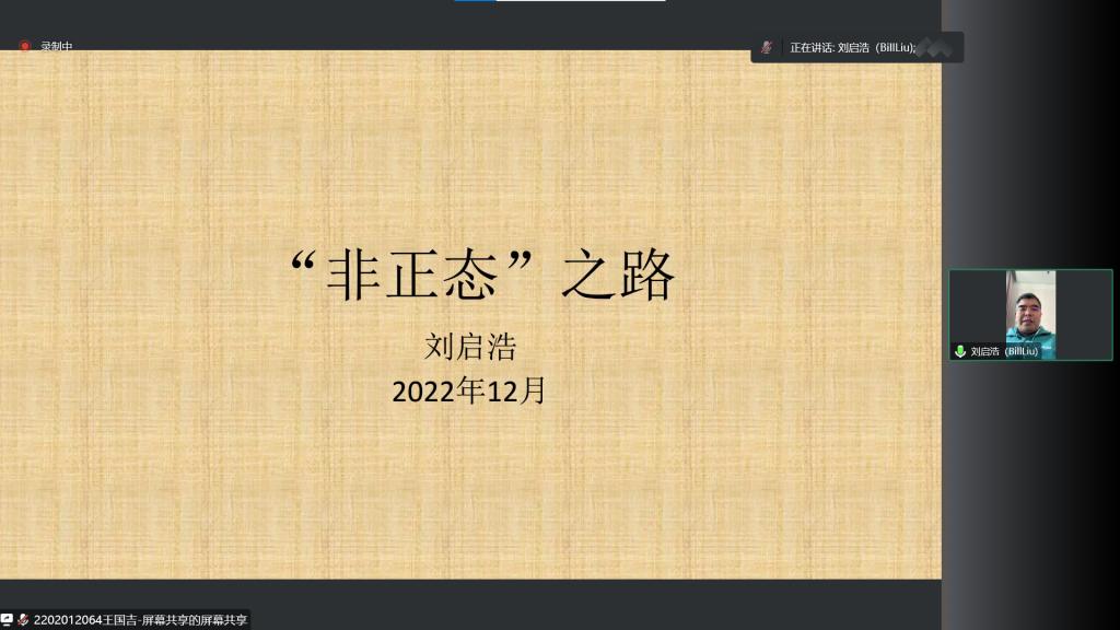 (通讯员:关迪)为了扩展学生的专业思维,提升专业知识的理论学习水平,2022年12月30日下午13:30,由科研处和beat365官方网站主办的报告——“非正态之路”在腾讯会议线上举行,特别邀请刘启浩博士作为主讲人,基于刘博士本人的研究以及工作经历,为beat365官网师生进行讲解,我院共有160多名师生前来参会讨论与学习。我院beat365官方网站院长王纯杰、副院长李纯净等均参与会议讨论,会议院长王纯杰主持。