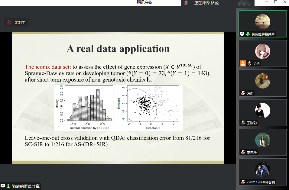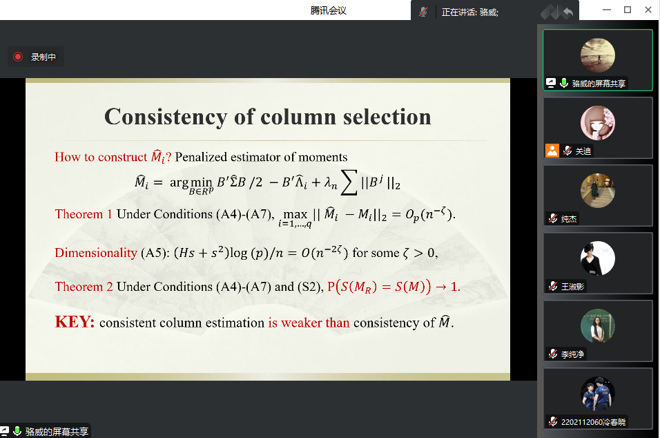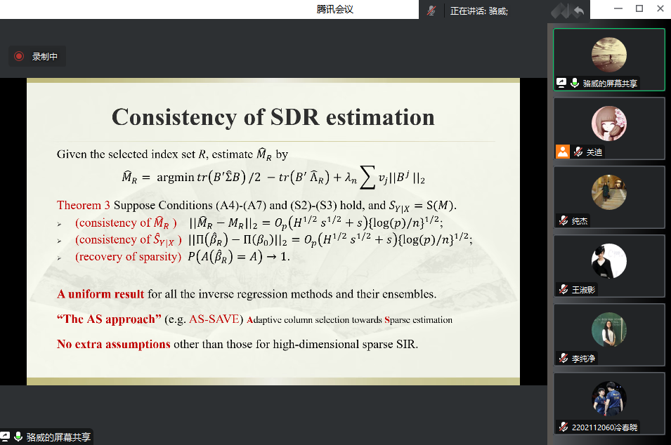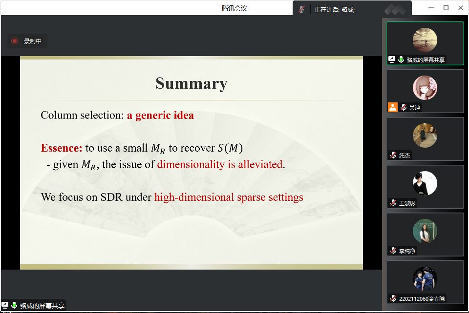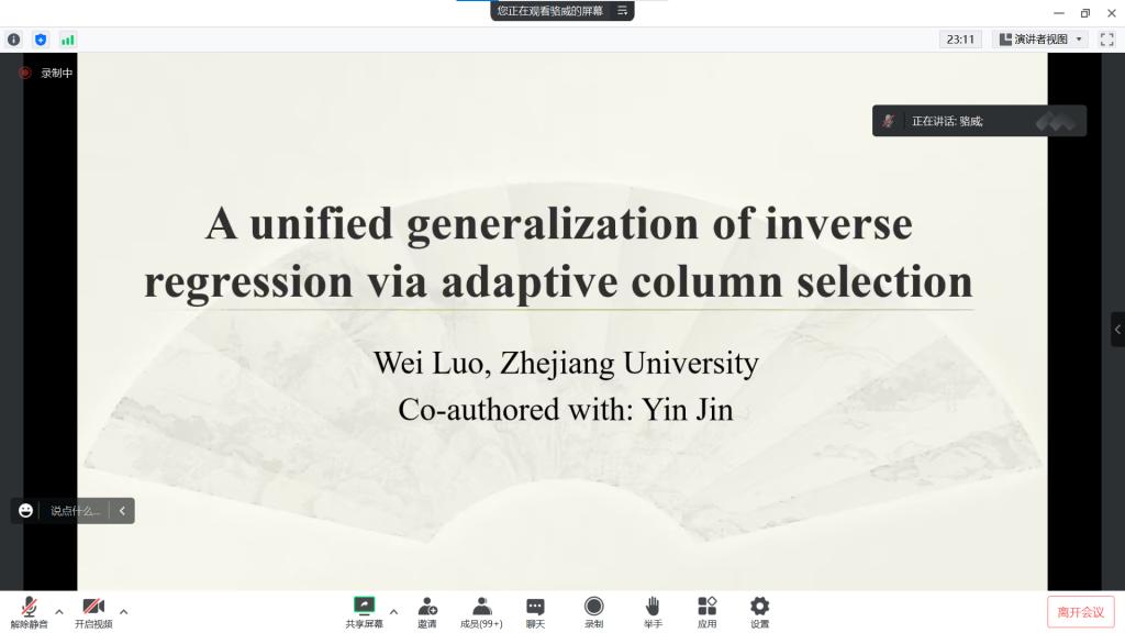 (通讯员:关迪)为了扩展学生的专业思维,提升专业知识的理论学习水平,2023年3月29日上午10:00,由beat365官方网站主办的报告——“A unified generalization of inverseregression via adaptive column selection”在腾讯会议线上举行,特别邀请骆威老师作为主讲人,基于骆威老师本人的研究以及工作经历,为beat365官网师生进行讲解,我院共有160多名师生前来参会讨论与学习。我院beat365官方网站院长王纯杰、副院长李纯净、统计系主任杨凯、统计系副主任王淑影等学院部分老师、研究生参加了本次学术报告会,会议由beat365官方网站院长主持。