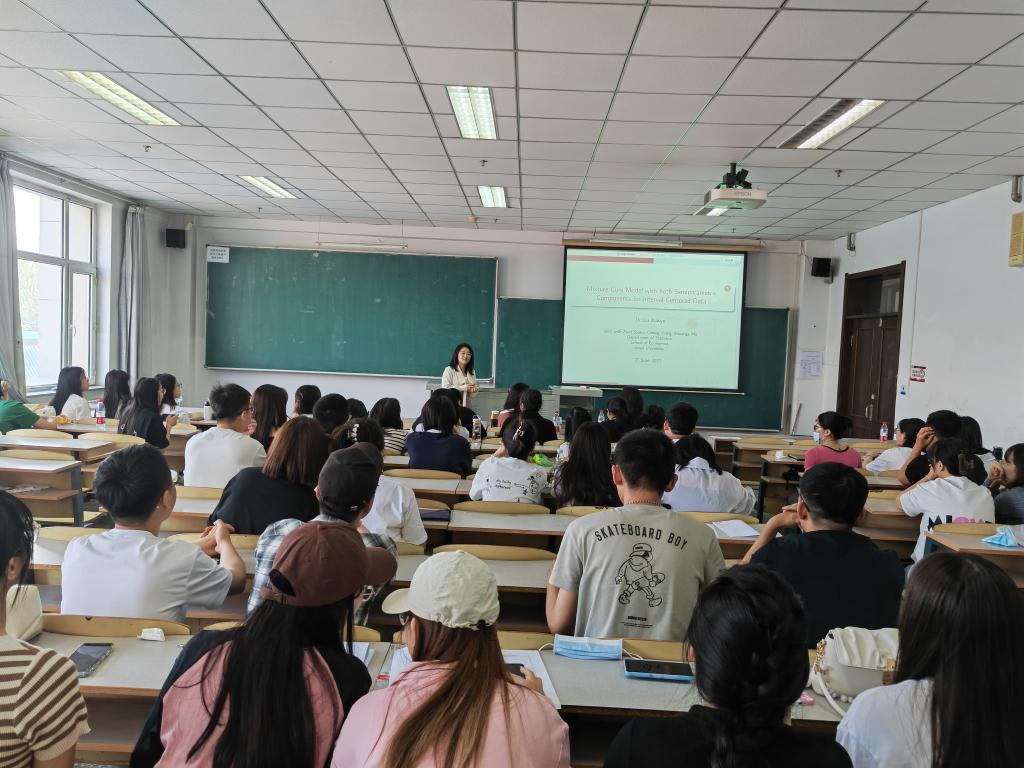 在接下来的报告中,刘晓玉教授围绕“Mixture Cure Model with both Semiparametric Components for Interval-Censored Data”开始讲解,通过生存分析删失数据、线性和非线性协变量、左删失、区间删失、右删失等方面进行知识讲解,用通俗易懂的语言与生活等其他方面都进行了联系与结合,由浅入深地向同学们讲解相关知识,使枯燥的知识变得有意思起来。
