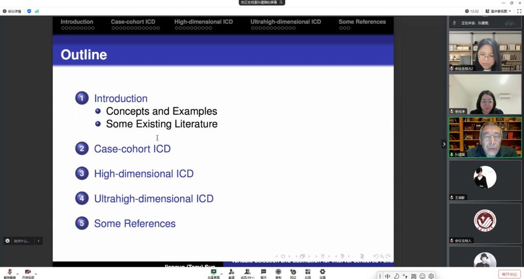 报告会中,孙教授主要介绍了在生存分析问题中关于变量选择问题的处理方法。孙教授基于三类不同模型进行了讲解和阐述:第一个是正常的情况下如何进行变量选择;第二个是在高维具有协变量效应的非参数变量选择问题;第三个是超高维情形下,在变量很难选的条件下如何进行变量的选择。最后,孙教授还介绍了在变量选择时的细节,以帮助大家理解。