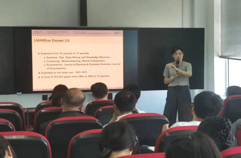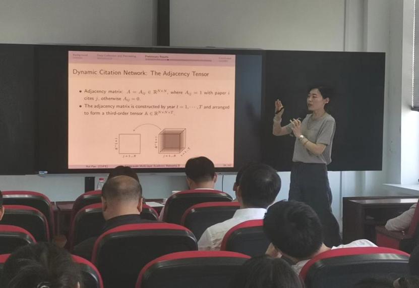 在接下来的报告中,潘教授介绍了大规模的多层学术网络数据集——LMANStat,该数据集涵盖了合作、共机构、引用、共被引、期刊引用、作者引用、作者-论文以及关键词共现等网络。此外,多层学术网络的每一层都是动态的。我们还丰富了节点的属性,如作者的研究兴趣、生产力、地区和机构等。基于此数据集,可以多角度研究统计学科的发展与演变。这一数据集也为研究具有多层结构的复杂系统提供了肥沃土壤。