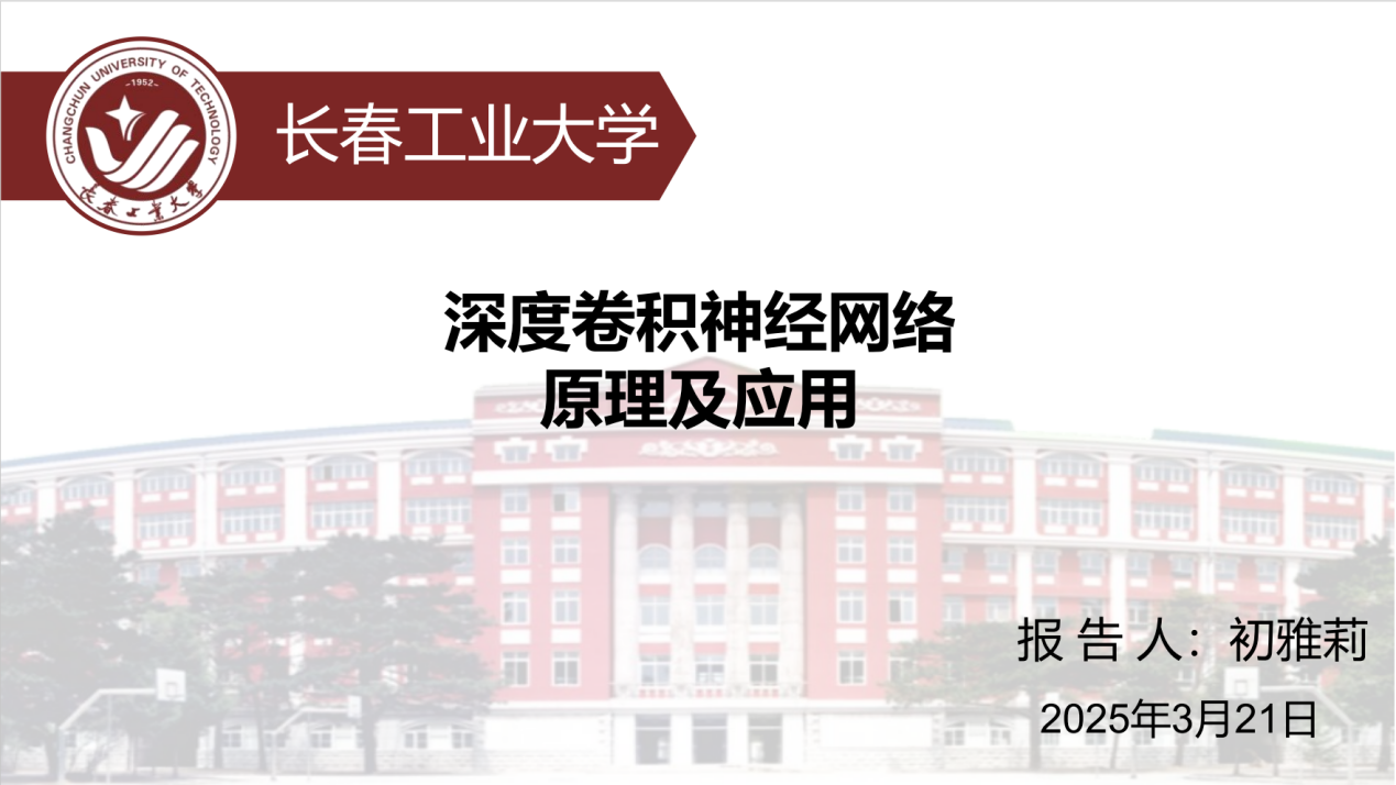 报告题目为"Principles and Applications of Deep Convolutional Neural Networks",报告围绕深度卷积神经网络的工作原理及应用展开。神经网络发展历经五个阶段,从模型提出到深度学习崛起,深度卷积神经网络应运而生;卷积神经网络模仿人类视觉皮质工作,由卷积层、池化层和全连接层构成;在多个领域应用广泛,但面临复现难和硬件要求高的问题。