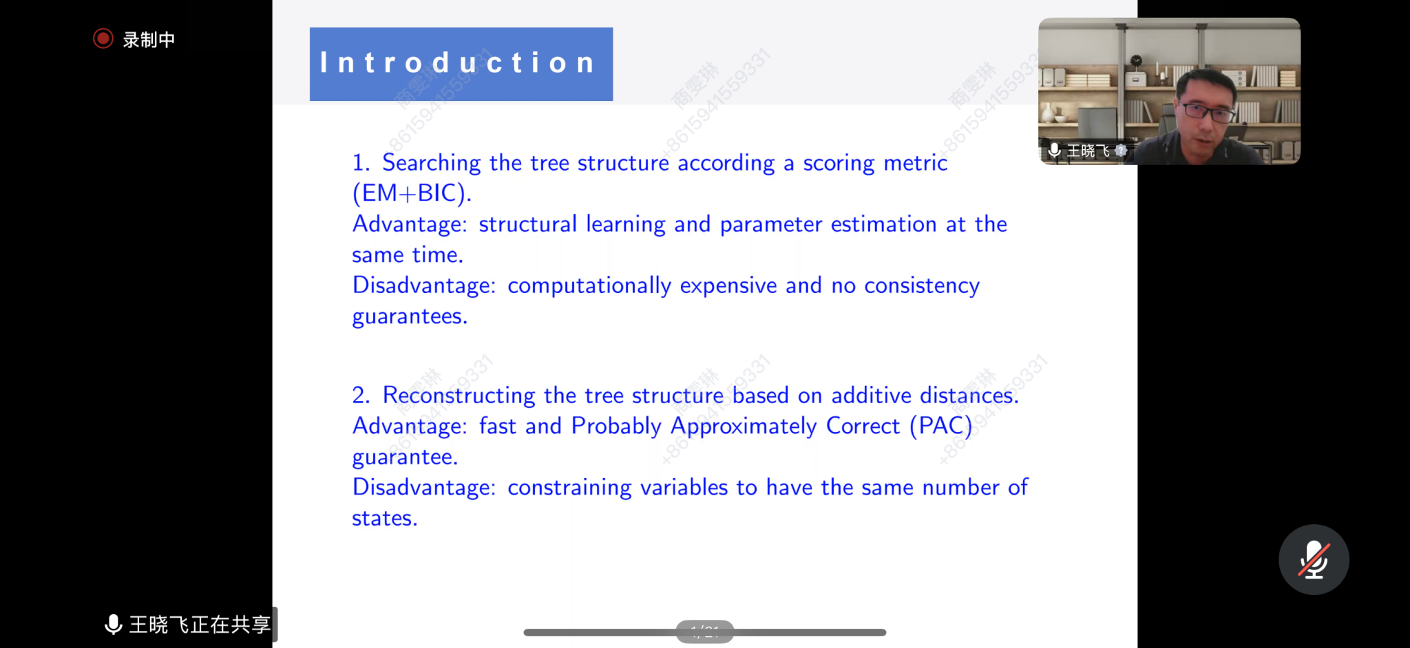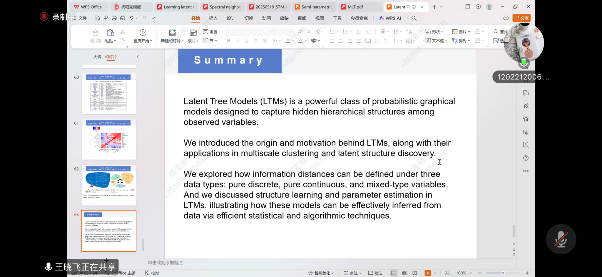 在报告中,王晓飞教授介绍了潜在树模型(LTM),接着,讨论了两种树结构学习方法及它们的优缺点:一种是根据评分指标(EM+BIC)搜索树结构;另一种是基于加性距离重建树结构。并介绍了了LTM的起源、动机及其在多尺度聚类和潜在结构发现中的应用,并探讨了如何在纯离散、纯连续和混合类型变量三种数据类型下定义信息距离,以及如何通过有效的统计和算法技术进行结构学习和参数估计,从而从数据中有效推断LTM。