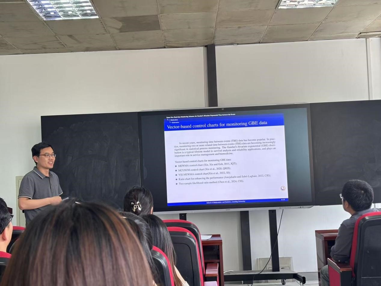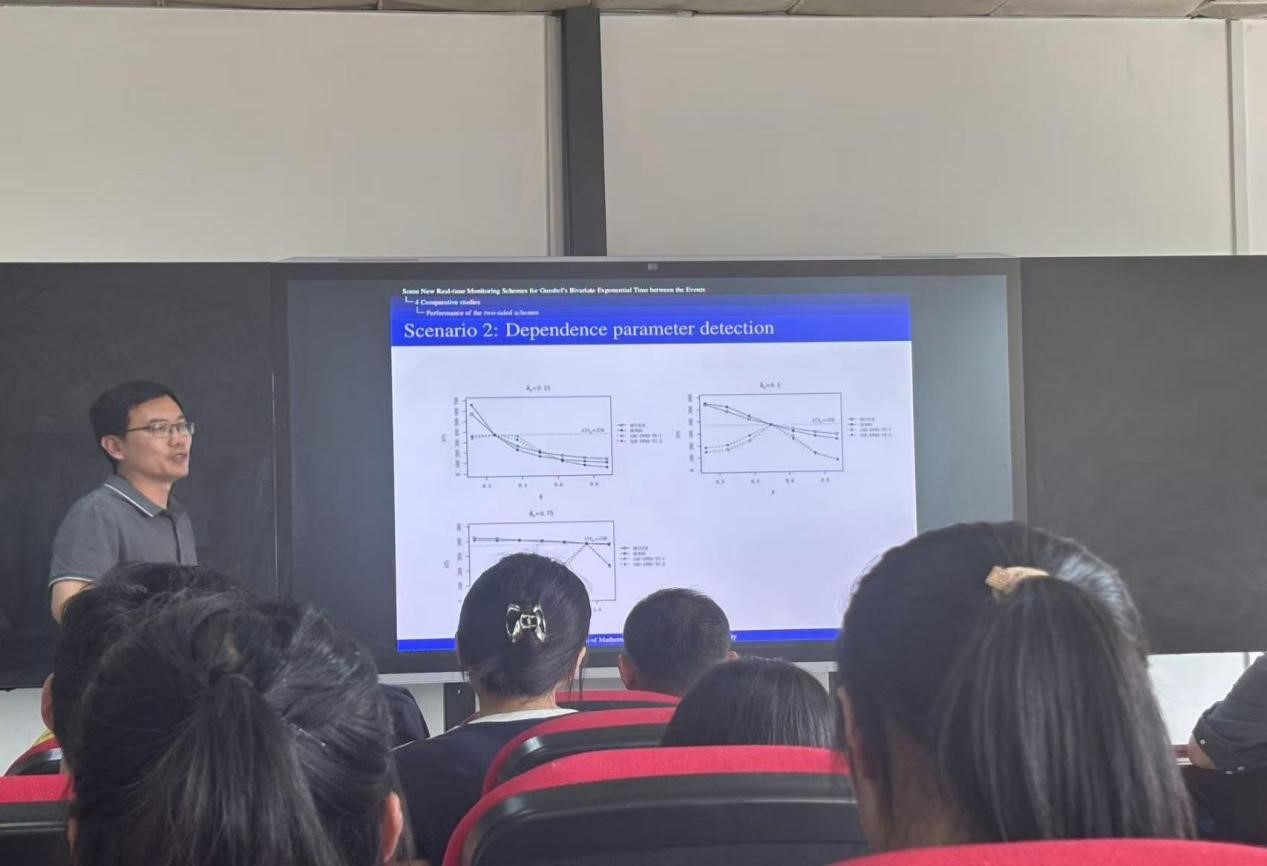 接下来张久军教授介绍了基于 GBE 分布生存函数推导出的四种 EWMA 监控方案,详细阐释每个方案的构建思路与核心统计量。再利用马尔可夫链模型,将控制区间细分,通过计算状态转移概率矩阵来精准求解平均信号时间(ATS),并运用遗传算法,以给定初始信号时间为约束,对平滑参数和控制限系数进行优化,然后开展对比研究,将所提四种方案与 MEWMA 和 MCUSUM 方案对比,从检测尺度参数和依赖参数变化的角度,以 ATS 为衡量指标,凸显新方案优势;同时借助短信响应时间等三组真实数据,直观验证方案在实际场景中的有效性与高效性。