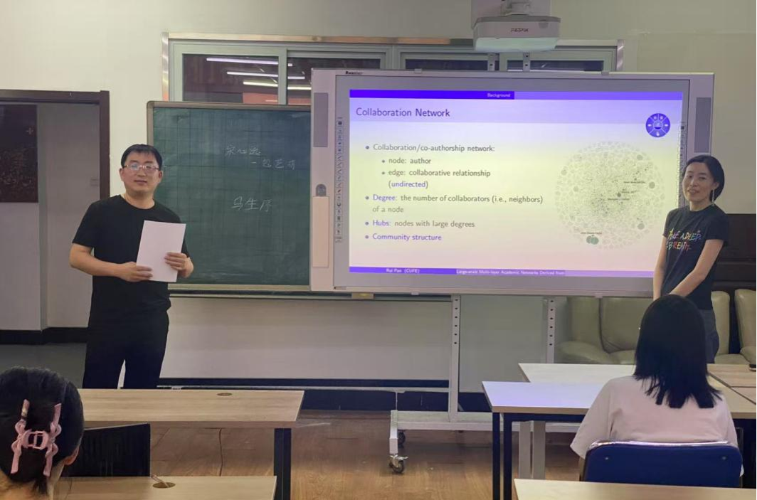该研究构建了基于42种统计学期刊(1981-2021年)的大规模多层学术网络数据集LMANStat,涵盖合作网络、引用网络、关键词共现网络等8类网络结构,包含97,436篇论文、70,735位作者及500余万条关系数据。研究通过四步流程解决作者同名问题,并提取研究兴趣、生产力等多维作者属性。进一步扩展的LMANStat Embedding数据集新增28种跨学科期刊,采用OpenAI模型生成论文摘要的1536维嵌入向量以支持语义分析。基于该数据集,团队在社区检测(如D-SCORE算法)、引用预测、学术推荐等领域取得系列成果,相关论文发表于Statistics and Its Interface等期刊。数据集已开源,为学术网络分析、科研评价及知识发现提供了多维度、动态化的研究基础,推动了统计学与信息科学的交叉创新。最后,潘教授对报告进行了总结,同学们针对报告内容与潘教授进行了交流与讨论。
