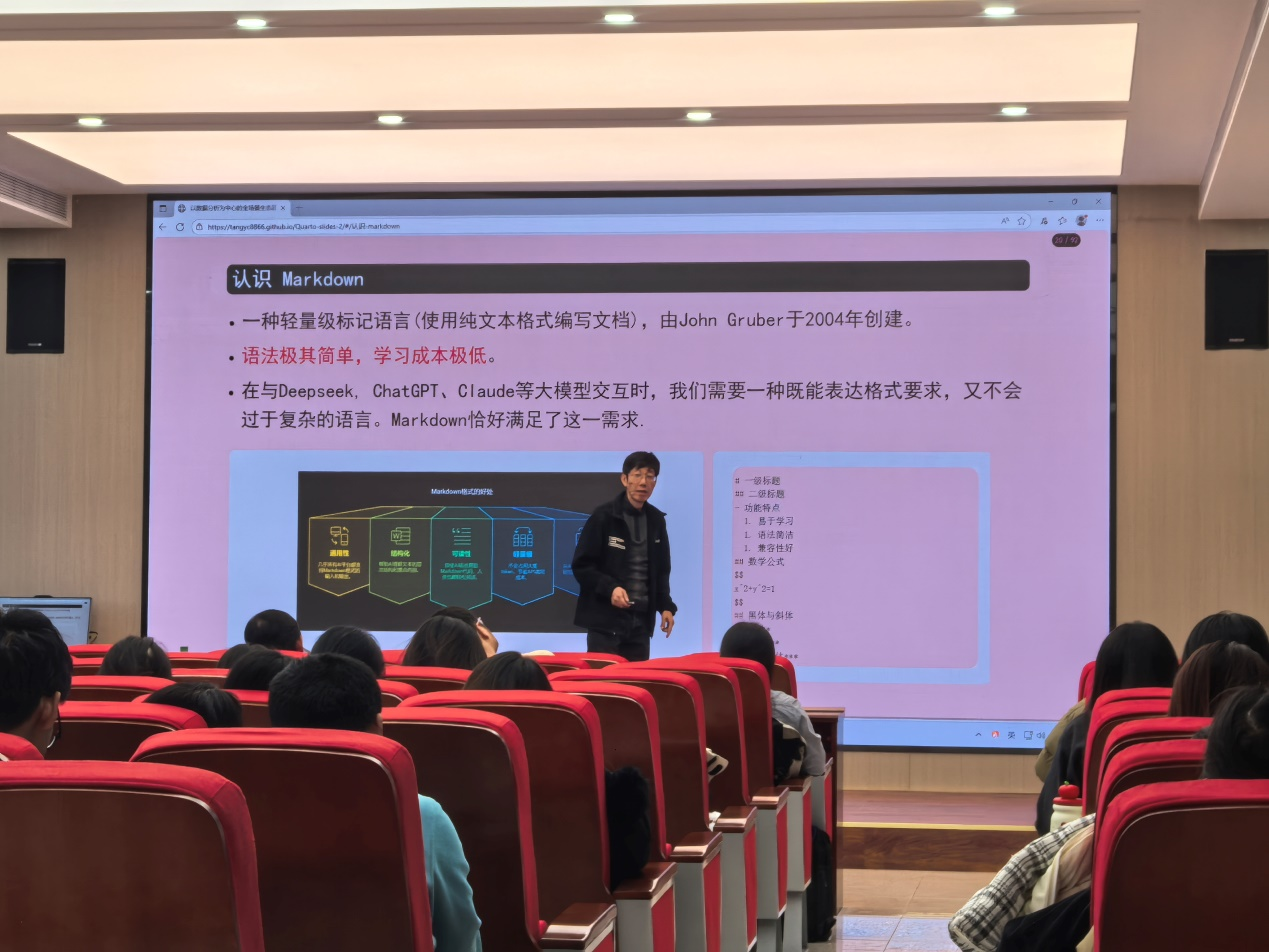 接下来,汤教授向在场师生介绍了 Markdown的相关内容。汤教授指出,Markdown 是由 John Gruber 于 2004 年创建的轻量级标记语言,它采用纯文本格式编写文档,语法极其简单,学习成本极低。在与 Deepseek、ChatGPT、Claude 等大模型交互时,需要一种既能满足格式表达要求,又不会过于复杂的语言,而 Markdown 恰好契合这一需求。之后,汤教授还向大家呈现了 Markdown 的多种应用场景和格式示例。比如有一级标题的格式展示,还有列表形式,像分点罗列的 “数字学习”、“深度学习”、“增强学习” 等内容;也有数学公式的示例,如 “x+y=1”;同时还有整体与斜体格式的呈现。这些示例直观地展现了 Markdown 在不同场景下的功能,帮助学习者清晰地认识到它在文档编写、与大模型交互等方面的便捷性和实用性。