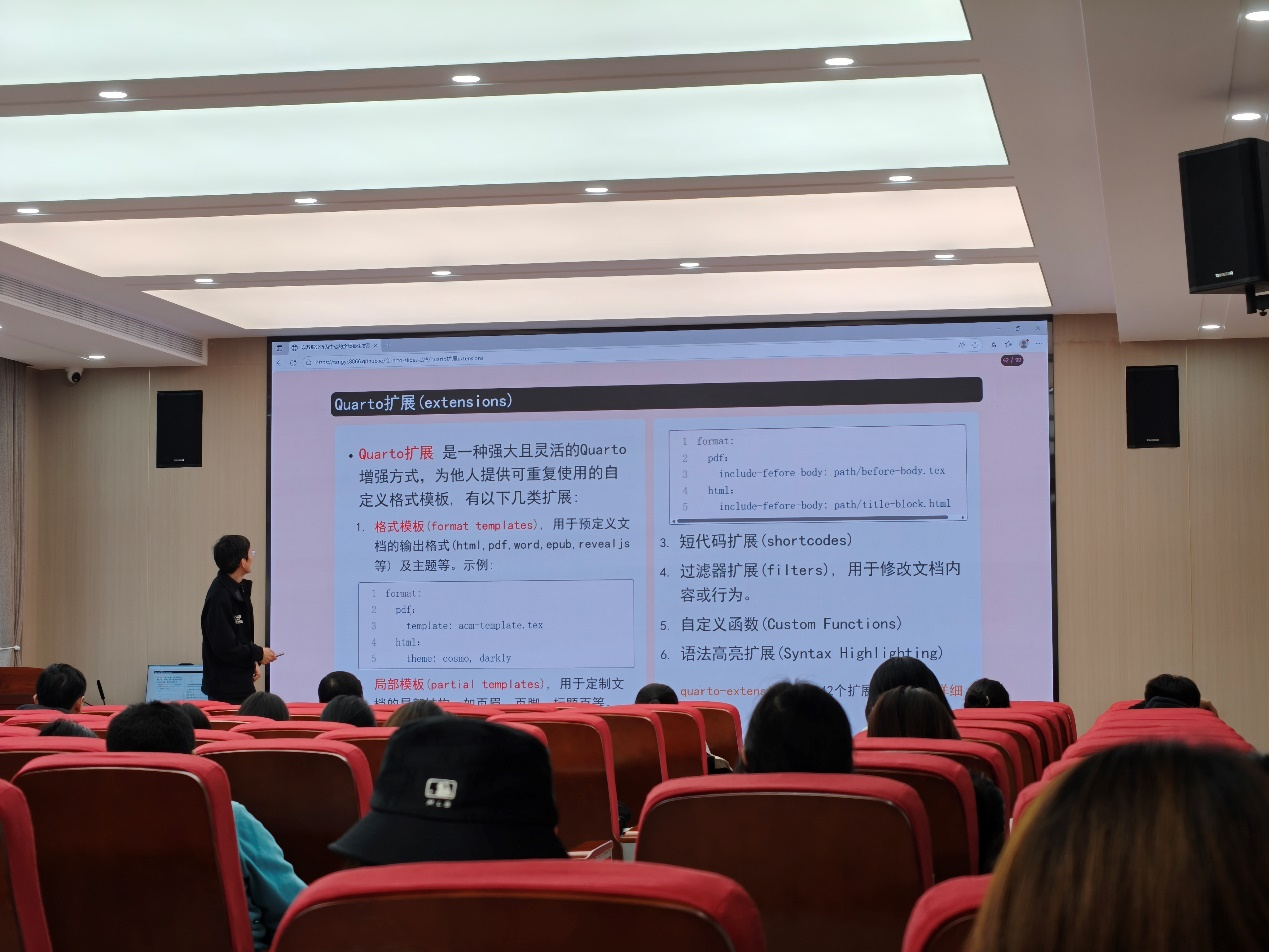在报告的最后环节,汤教授聚焦 “Quarto 扩展”,为在场听众深入解析其作为强大且灵活的 Quarto 增强方式的核心价值。他指出,Quarto 扩展可提供可重复使用的自定义格式模板,涵盖多类扩展类型:其一,格式模板(format templates),用于预定义文档输出格式(如 html、pdf、word、epub、reveal.js 等)及主题,示例中展示了 pdf、html 格式模板的配置方式;其二,局部模板(partial templates),用于定制文档局部布局,如页脚、页眉、导航栏等;其三,短代码扩展(shortcodes);其四,过滤器扩展(filters),用于修改文档内容或行为;其五,自定义函数(Custom Functions);其六,语法高亮扩展(Syntax Highlighting)。这些丰富的扩展类型极大地提升了 Quarto 在文档创作中的灵活性与效率,为用户定制文档格式、优化功能提供了多元解决方案,助力使用者在学术、技术等文档创作场景中实现更专业、更个性化的输出。