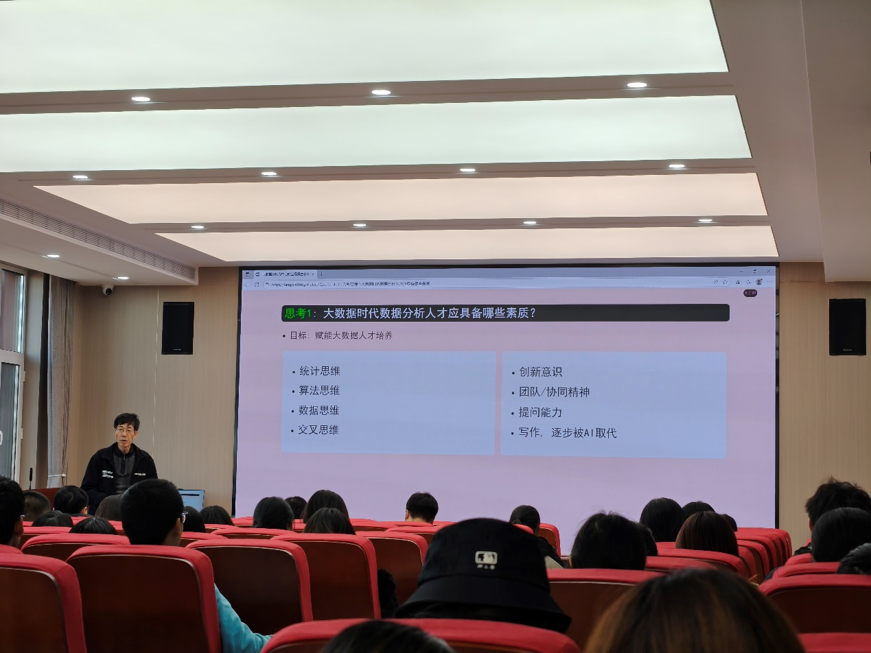 报告伊始,汤银才教授以“文字化统计编程的探索与思考”为题,提出了三个引人深思的核心问题,围绕大数据时代数据分析人才应具备的素质展开探讨。他指出,在数据驱动日益成为主流的今天,统计思维、算法思维、数据思维与交叉思维已成为数据分析人才不可或缺的核心能力;创新意识、团队协作精神以及有效提问的能力,也成为高质量大数据人才培养的关键。汤教授进一步结合Quartet数据科学新范式,探讨了统计编程与文字表达的融合路径。