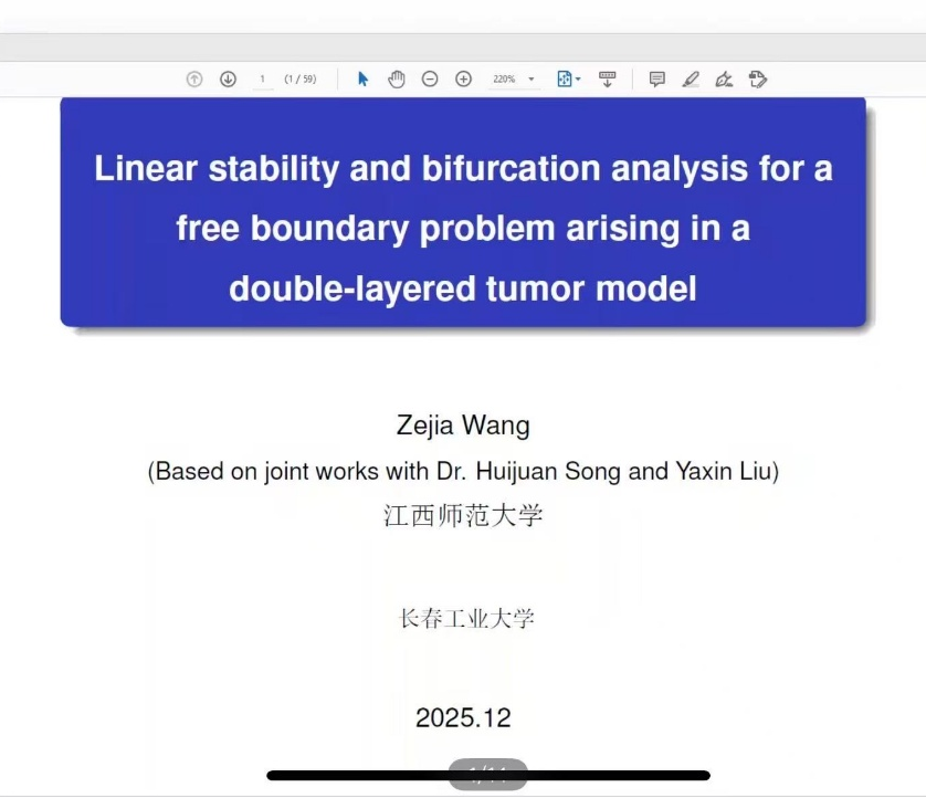 王泽佳教授报告的核心是基于数学角度,研究双层肿瘤的自由边界问题。她指出肿瘤的生长特性导致其与正常组织之间存在分界,并表现出分层结构(如繁衍层和休眠层)。这是肿瘤在生物层面上真实存在的现象。数学上使用自由边界问题来描述这一动态过程,其中肿瘤的边界是一个随时间变化的未知量。