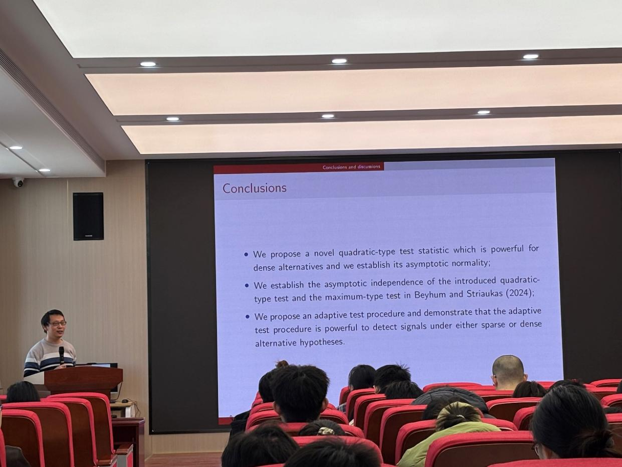 最后,郭老师对此次报告进行了总结。提出了一种新的二次型检验统计量,证明了其渐近正态性,并建立了其与现有最大型检验的渐近独立性。构建了一个自适应检验程序,该程序能够结合两种统计量的优势,无论备择假设是稀疏还是稠密,均能保持较高的检验功效,从而实现了对高维因子模型中回归系数显著性问题的稳健且全面的检验。