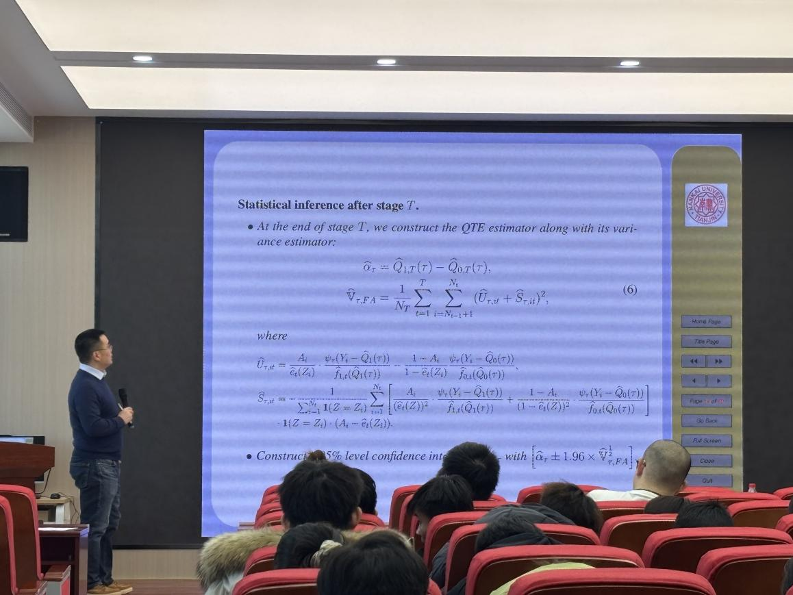 最后,李教授总结了本文研究的主要贡献。首先,从半参数理论的角度,为分位数处理效应的估计推导了一个基于设计的最优方差下界,并提出了多阶段设计和完全自适应设计两种策略,均能达到该下界。其次,研究通过理论论证和模拟研究,权衡比较了两种设计在实际实施中的利弊。最终,研究确立了基于所提自适应设计收集数据所估计的分位数处理效应具有渐近正态性,并从理论上证明了当考虑连续协变量时,多阶段设计相较于完全自适应设计能带来效率提升。