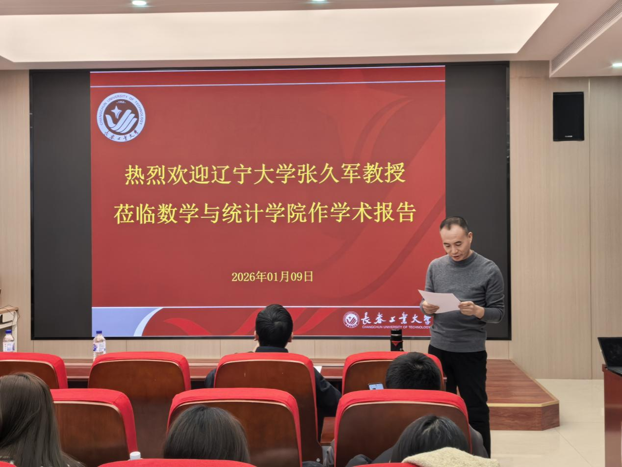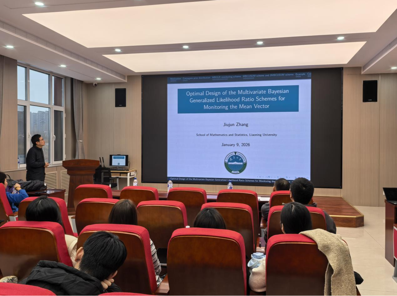 (通讯员:王芷月)2026年1月9日下午16:30,辽宁大学张久军教授莅临beat365官方网站,针对多元贝叶斯广义似然比监控方案的均值向量优化设计问题,开展了一场专业且富有启发性的学术报告。本次报告由beat365官方网站承办,在北湖东校区数统新楼201室进行,会议由beat365官方网站赵志文教授主持,学院副院长杨凯、赵波老师等及学院研究生参加了本次学术报告会。