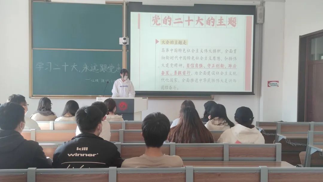 会议伊始,同学们遵守防疫要求间隔一米在教室落座。会议深入学习和领悟了习近平总书记在党的二十大上作的报告。报告指出:“青年强,则国家强。当代中国青年生逢其时,施展才干的舞台无比广阔,实现梦想的前景无比光明。"党向新时代青年学生的嘱托与希望,宣传教育送到学生身边,参会全体学生表示要坚定理想信念,永远跟党走,奋进新征程,建功新时代,在学习生活和工作中树牢“四个意识”,坚定”四个自信”,坚决做到“两个维护”;自信自强,守正创新蹲厉奋发,勇毅前行,为实现中华民族伟大复兴的美好未来努力学习。