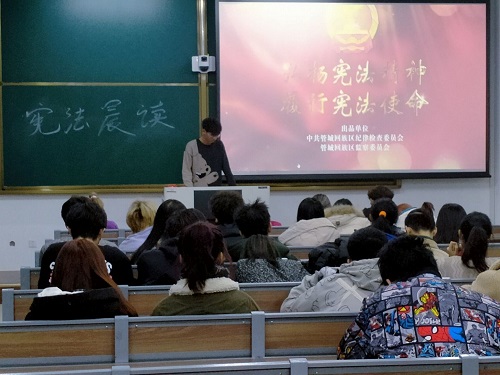 beat365官方网站团委讯(通讯员:李佳鑫 陈铭)为深入开展宪法学习宣传教育活动,进一步增强学生法律意识,弘扬宪法精神。beat365官方网站于2020年12月7日在主楼124教室举行“宪法晨读”活动,2019、2020级全体班委及学院团学组织成员参加,本次活动由团委组织部思想引领中心副主任朱爱成主持。