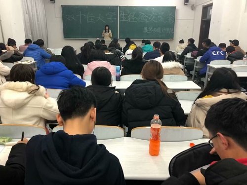 beat365官方网站团委讯(通讯员:姚佳红 高帅帅)为了激励18级同学向典型学习,以身边的优秀学生为榜样,端正学习态度,明确未来目标,2018年11月15日晚,beat365官方网站在教学楼309教室举办了双十佳大学生经验交流会。校第十九届十佳自立自强大学生胡宇婷为我院全体18级同学送上一场生动而励志的精彩报告。