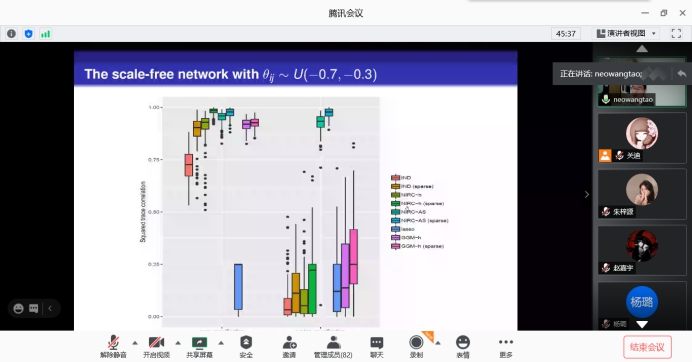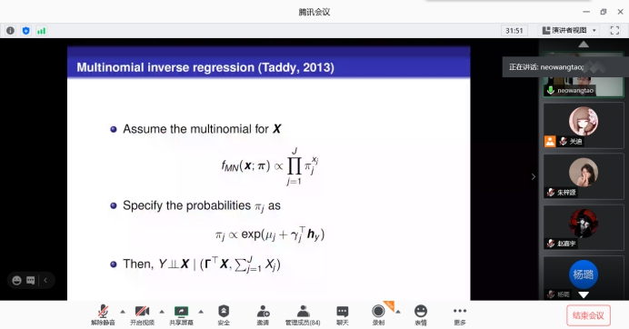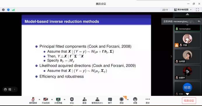 在报告中,王涛教授首先介绍了本次报告会的主要内容,并介绍了逆回归和降维的重要性,然后开始细致的讲解,对于回归中减少维数的目标是在不损失回归信息的情况下减小预测变量空间的维数。在许多领域中,响应的预测因子都是计数值,包括生态研究中的物种丰富度,文本挖掘中的短语标记以及计量经济学中的面板数据,最后使用计数值预测变量进行回归的降维方法。并使用Poisson独立模型及其概括,通过对给定响应的预测变量的条件分布进行建模来遵循逆回归方法,然后简要讨论一个新建议,得出更好的结果。