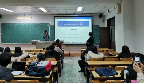 在报告中,冯副教授首先向我们细致深刻的分析了一个高维面板数据的横截面独立性测试问题,用线性回归模型描述了截面相关性。冯副教授向我们讲述了他研究的三个测试,即the sum test、the max test和the max-sum test,其中后两个是新的。报告中分别设计了线性回归中稀疏残差和非稀疏残差的最大和和检验,并设计了最大和检验来保证残差的两种情况。此外,冯副教授还建立了面板数据线性回归模型中样本相关系数极大值的渐近理论,这也是对高维数据这方面知识的首次成功尝试。最后,冯副教授进行了大量的仿真研究和案例研究。证明了冯副教授提出的方法在残差是否稀疏的情况下,经验能力和稳健性方面都具有优势。