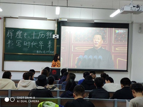 团会中,张宁馨分别从建立新中国、改革开放的伟大飞跃和建立现代化强国三个方面展开。今年是中国共产党成立98周年,是我们党执政70周年,实行改革开放41周年,实践充分证明了中国共产党是具有强大创造力凝聚力战斗力和领导力号召力的伟大政党,中华民族是能够自立于世界民族之林,能够对人类做出较大贡献的伟大民族。理论学习会上,张宁馨带领大家观看了习近平总书记在中华人民共和国成立70周年庆祝大会上的重要讲话的视频,同学们认真聆听习近平总书记的讲话,当听到习近平总书记说:“没有任何力量能够撼动我们祖国的地位,没有任何力量能够阻挡中国人民和中华民族的前进步伐时。”教室里响起了同学们热烈的掌声。此外,为了学习革命老英雄不畏生死、保家卫国、淡泊名利的精神,同学们还观看了革命老英雄张富清的事迹视频。在团会的尾声时,张宁馨向新上当选的2019级各班的团支部书记和委员强调,祖国的繁荣昌盛来之不易,作为新时代青年大学生,我们要坚决维护习近平总书记核心地位,坚决维护党中央权威和集中统一领导。