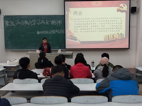 会上,林思扬向同学们介绍了两会的由来和对于国家运作的重大意义以及适用广泛的特点。并表明了两会召开的意义在于将两会代表从人民中来的信息和要求进行收集及整理,传达给党中央。林思扬为学生们展示了2019年两会统筹推进“五位一体”总体布局,协调推进“四个全面”战略布局,坚持稳中求进工作总基调,坚持新发展理念,坚持推动高质量发展,坚持以供给侧结构性改革为主线的中心思想。学习最后,三名大一同学代表分别提出了自己对继续打好三大攻坚战、进一步扩大对外开放等民众最为关注的六个方面的两会议题的深刻想法,并表现出作为当代共青团青年大学生要认真学习、踏实工作的积极态度。